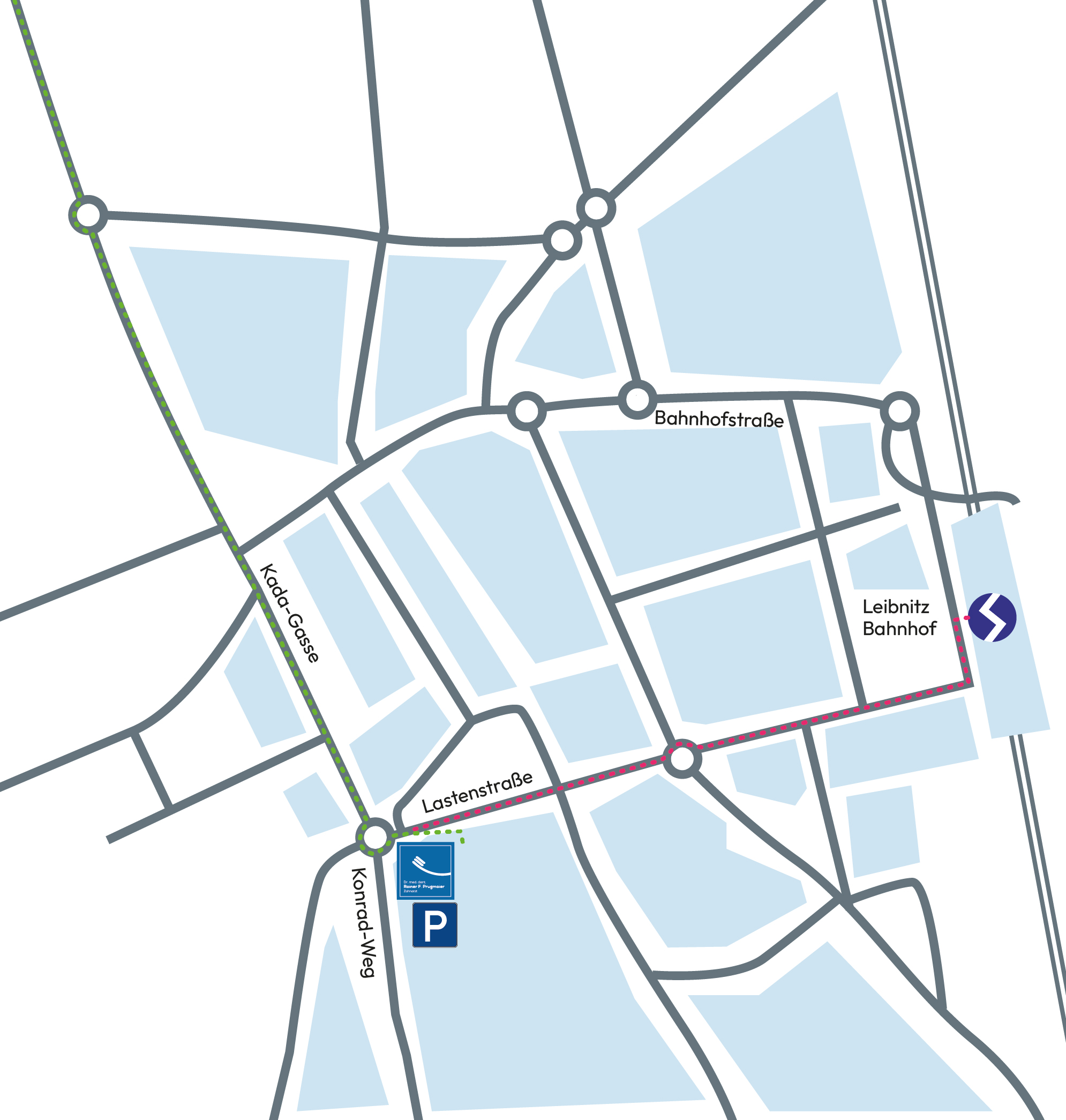 Nach dem Verlassen des Bahnhofs gehen Sie nach links den Bahnhofgürtel entlang in Richtung Lastenstraße. Der Bahnhofgürtel biegt anschließend nach rechts ab und geht in die Lastenstraße über.